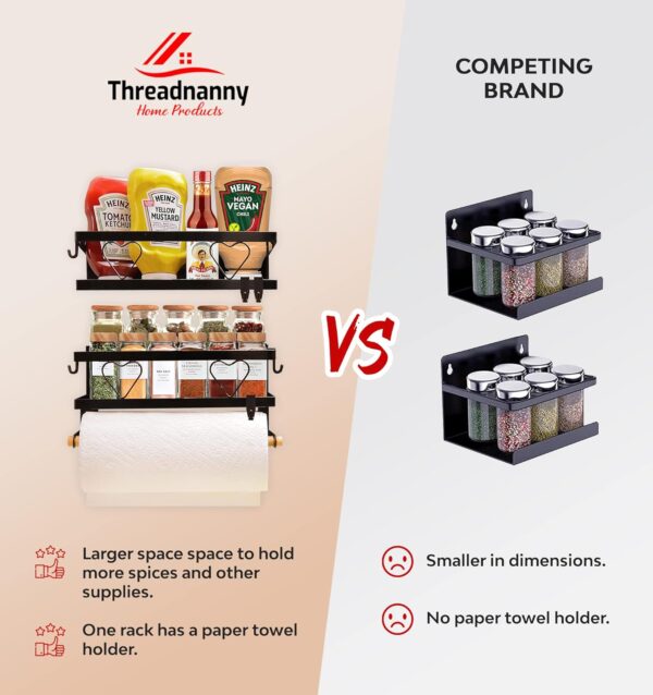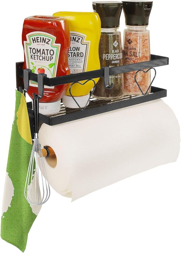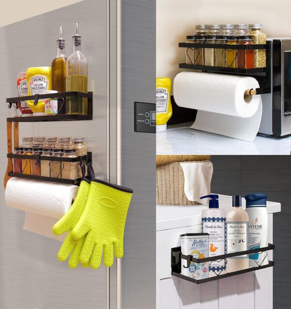 - ✔ 1-PACK MAGNETIC SPICE RACK WITH PAPER TOWEL HOLDER & FREE 3PCS HANGING HOOKS: Fridge magnetic organizer with free 3 pieces hanging hooks (the spice jars and the other items on the rack are not included). Superior quality magnetic refrigerator organizer that features a unique and modern design with smooth rounded edges. Very easy to install with no drilling required.