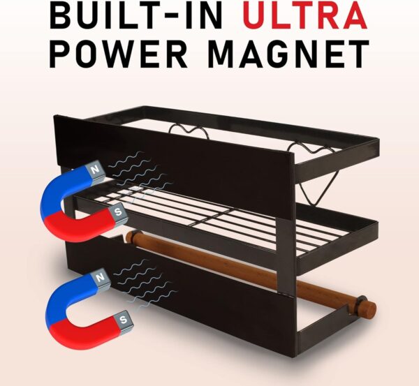 - ✔ BUILT-IN HIGH POWER MAGNET, VERSATILE MAGNETIC SHELF HOME ORGANIZER: Magnetic fridge organizer that comes with an engineered ultra magnet on the back keeping it strongly attached and in place without budging. Heavy duty magnetic spice storage that can hold up to 4lbs., and won’t slide down. Magnetic spice organizer that also works on any metal appliances like microwave, stove, BBQ smoker, washer, dryer, etc. Can also work to hold bathroom, laundry and other home supplies.