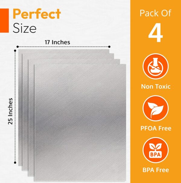 - PREMIUM QUALITY OVEN LINERS FOR BOTTOM OF OVEN: 4-piece set of large 17″x 25″ heavy duty non-stick oven liner for bottom of electric oven that fit most standard-sized ovens. Can be trimmed for a custom fit. Ideal protection to keep your oven free of baked-on spills. Safe for temperatures of up to 500°F (260°C).