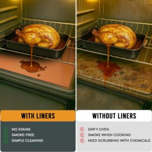 - SAVE TIME & EFFORT ON CLEANUP – Avoid scrubbing stubborn baked-on spills by using these durable oven liners. They make cleanup quick and easy, so you can spend less time cleaning and more time enjoying your meals.